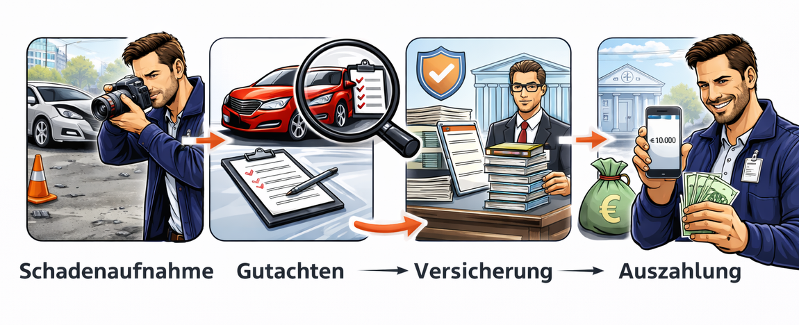 Darauf aufbauend helfen wir Ihnen dabei, Ihre rechtlich zustehenden Ansprüche vollständig geltend zu machen. Dazu gehören unter anderem Reparaturkosten, Wertminderung, Nutzungsausfall oder weitere unfallbedingte Kosten.